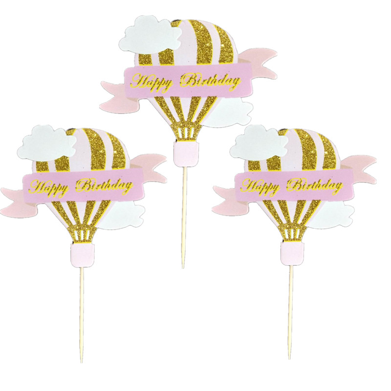 亮粉热气球云朵蛋糕装饰插牌 生日快乐蛋糕横幅插旗 甜品台 3个装热门设计联盟服务商