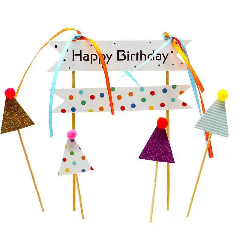 小清新蛋糕装饰生日快乐横幅插牌 丝带三角旗 毛球生日帽波点插件热门设计联盟服务商