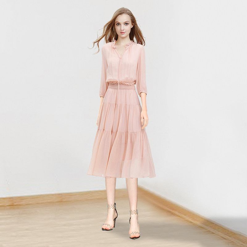 设计感小众粉色连衣裙女收腰2022夏新款中长款V领气质超仙淑女裙热门设计联盟服务商